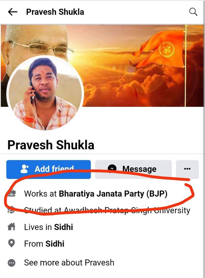 बीबीसी के अनुसार, पेशाब करने वाले युवक प्रवेश शुक्ला को बीजेपी नेता बताया जा रहा है और कहा जा रहा है कि वो सीधी से बीजेपी विधायक केदारनाथ शुक्ला के प्रतिनिधि रहे हैं।