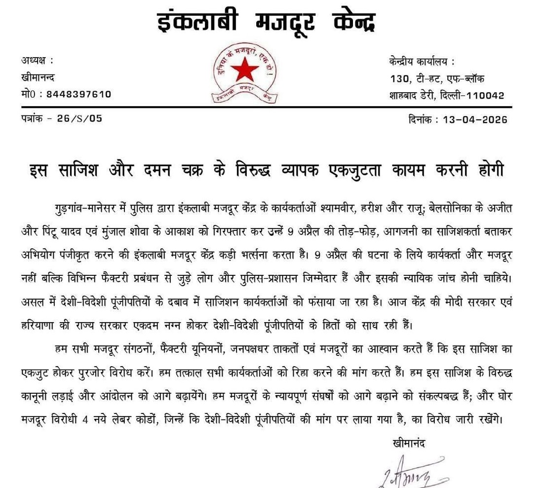 इंकलाबी मज़दूर केंद्र ने एक बयान जारी कर कहा है कि “9 अप्रैल की घटना के लिए इंकलाबी मज़दूर केंद्र के कार्यकर्ताओं श्यामवीर, हरीष और राजू, बेलसोनिका के अजीत और पिंटू यादव और मुंजाल शोवा के आकाश को गिरफ़्तार करने और उनके ख़िलाफ़ एफ़आईआर दर्ज करने की हम कड़ी निंदा करते हैं।”