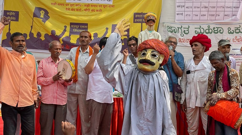 देश की राजधानी दिल्ली के जंतर-मंतर पर नरेगा मजदूरों का 100 दिवसीय धरने जारी है। राजस्थान से आए मज़दूरों ने कठपुतली नाटक के माध्यम से मनरेगा में लागू नए NMMS ऐप का विरोध किया गया।