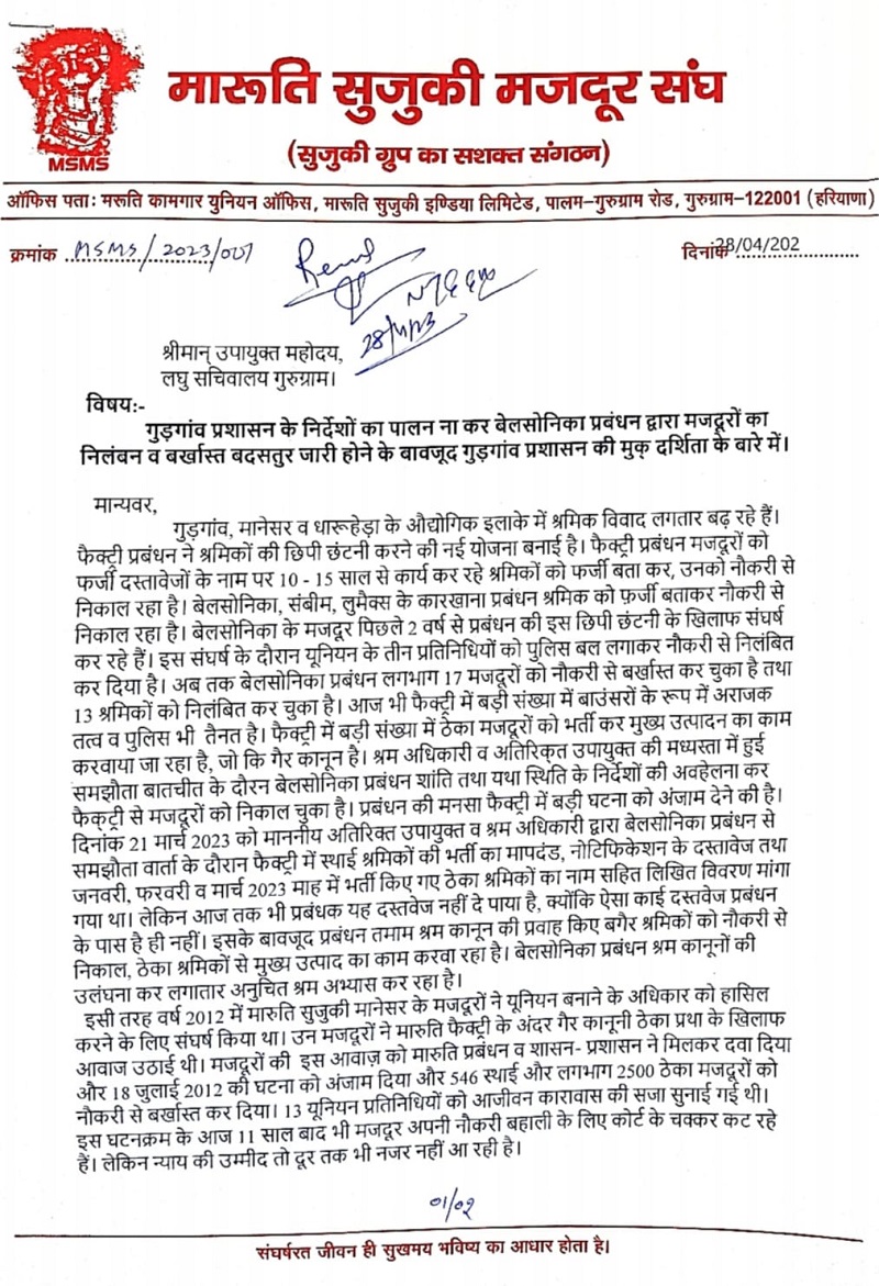 शुक्रवार को मारुति सुजुकी मजदूर संघ ने जुलूस निकाल कर बेलसोनिका प्रबंधन द्वारा मजदूरों के निलंबन व बर्खास्त करने की बदस्तूर जारी प्रक्रिया के खिलाफ उपायुक्त गुरुग्राम को ज्ञापन दिया।