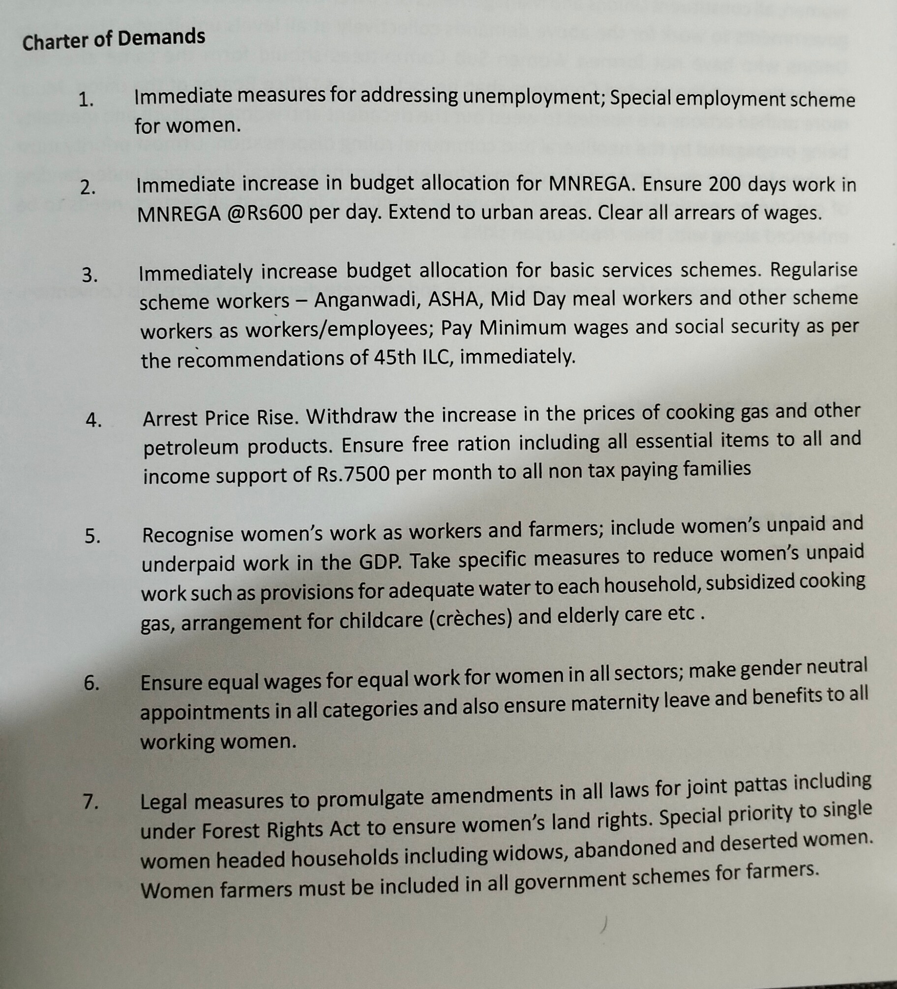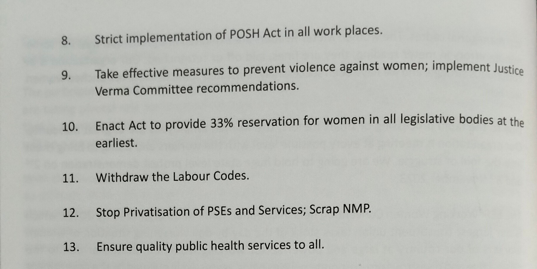 It was raised how the unholy Nexus of the BJP-RSS ruling regime with the corporates is reversing the progress made by the women workers through decades of struggle. Women, religious minorities, and Dalits are facing attacks from the ruling regime with a Manuvadi mindset. It was also stressed why it is important to understand the oppression of women through a class perspective.