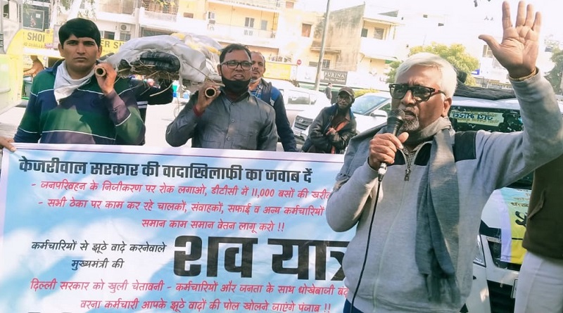 डीटीसी कर्मचारियों ने निकाली केजरीवाल की ‘शव यात्रा’, ठेका कर्मचारियों को परमानेंट किए जाने की मांग