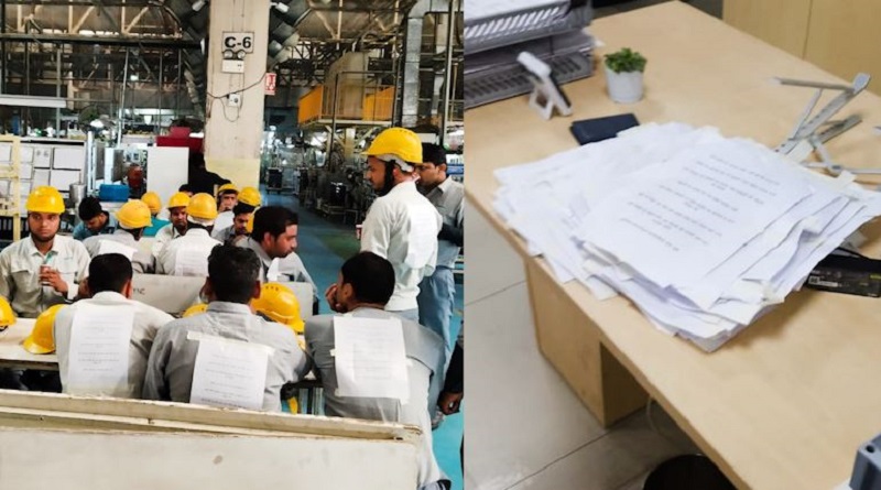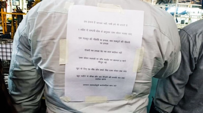 मज़दूरों ने अपनी पीठ पर एक पर्चा चिपका कर काम करने का फैसला किया, जिसमें एक अप्रैल से एयर वॉशर न चलाए जाने और घरेलू जांच बिठा कर छंटनी करने की कोशिशों की निंदा की।