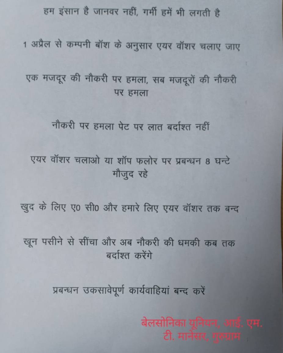 बेलसोनिका यूनियन के महासचिव अजीत सिंह ने कहा कि फैक्ट्री में मज़दूर अपना खून पसीना एक कर उत्पादन करता है और कंपनी को आगे ले जाता है लेकिन प्रबंधन की हर कोशिश इससे उलट होती है। इतनी भीषण गर्मी जब मैनेजमेंट की पूरी टीम एयरकंडीशन में बैठी है मज़दूर शॉप फ्लोर पर बिना बुनियादी एयर वॉशर के ही काम कर रहे हैं। ऐसे में दुर्घटना होने, सेहत बिगड़ने आदि की ख़तरा बरकरार है।