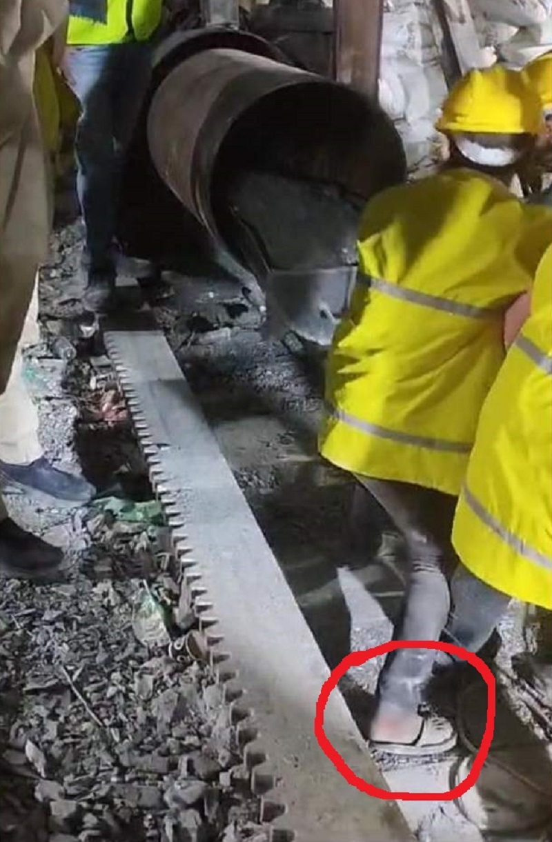 इसी तरह की एक तस्वीर सामने आई है जिसमें सुरंग में ड्रिल की जा रही पाइप के सहारे मज़दूरों को बचाने की कोशिश में लगे मज़दूर चप्पल पहने मेहनत करते दिख रहे हैं।