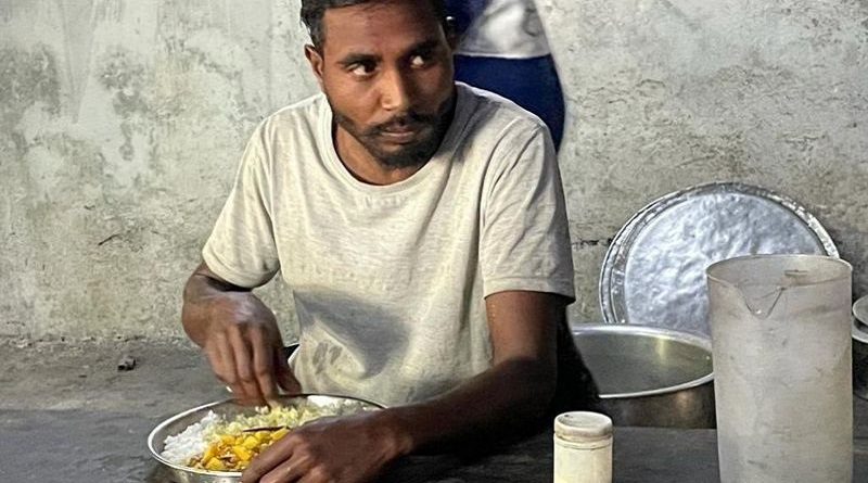 खाने के वक़्त इन मजदूरों को मेस में गर्म खाना मिलता है जिसमें रोटी, दाल, सब्ज़ी और चावल शामिल होता है।