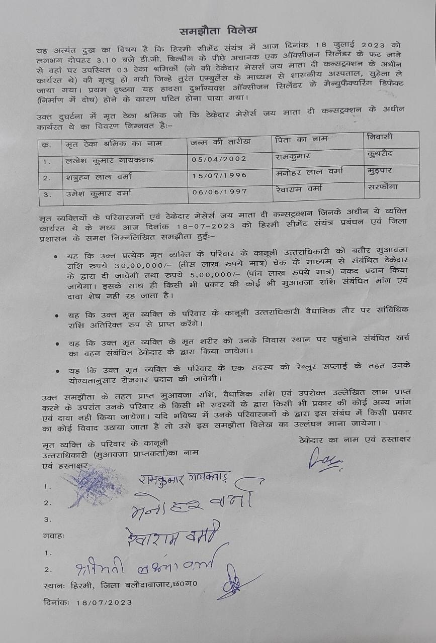 ये ठेका वर्कर ठेकेदार मेसर्स जय माता दी कंस्ट्रक्शन के कर्मचारी थे और हड़ताल के बाद यूनियन और ठेकेदार के बीच समझौता हुआ जिसके तहत मृतकों के परिजनों को 30 लाख रुपये चेक से और पांच लाख रुपये तत्काल दिए जाएंगे। परिवार के एक सदस्य को योग्यता अनुसार काम दिया जाएगा।