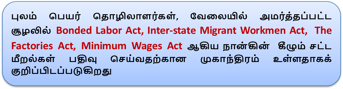 - புலம் பெயர் தொழிலாளர்கள் எந்த ஊரை சார்ந்தவர்கள், எந்த ஊரிற்கு புலம் பெயருகிறார்கள் என்று பதிவு செய்வது முதன்மை. மேலும் அவர்களுடைய போக்குவரத்து அந்தந்த நிர்வாகம்/ கான்ட்ராக்டரின் பொறுப்பாக இருத்தல் வேண்டும்.