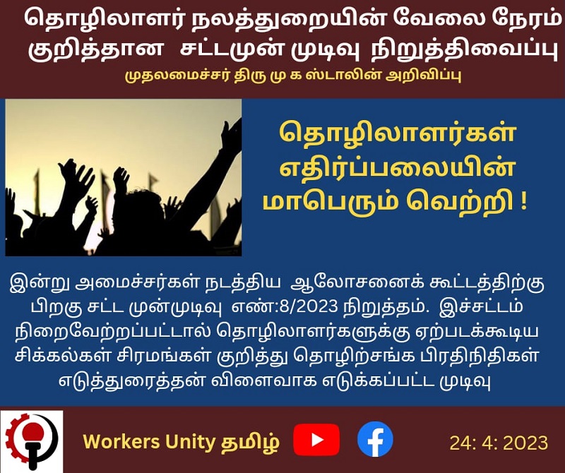 Yet we need not wait too long for when another Bill will be brought back to the table, for it is certain that an attack on labour rights and work conditions of workers in Tamil Nadu is waiting in the wings.